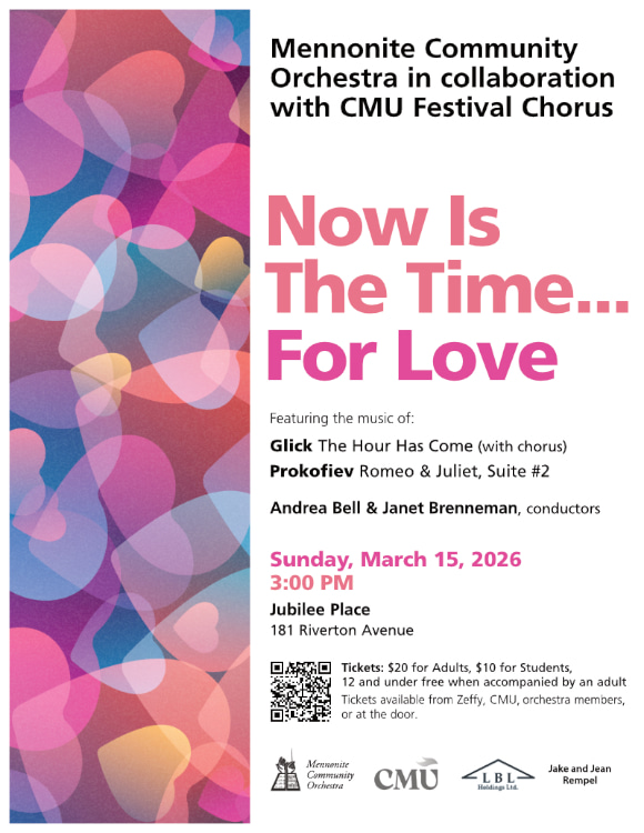 The Mennonite Community Orchestra’s ‘Now Is The Time…For Love’ concert will be held Sunday, March 15th at 3 pm at 181 Riverton Avenue.